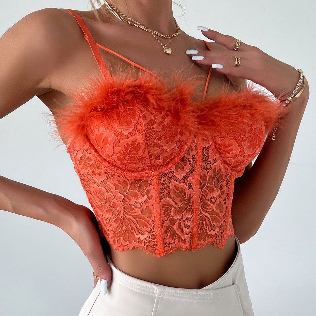 Whimsical Fur Sweetheart Neck Sheer Lace Crop Corset Top - Orange