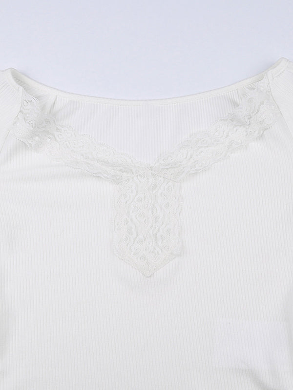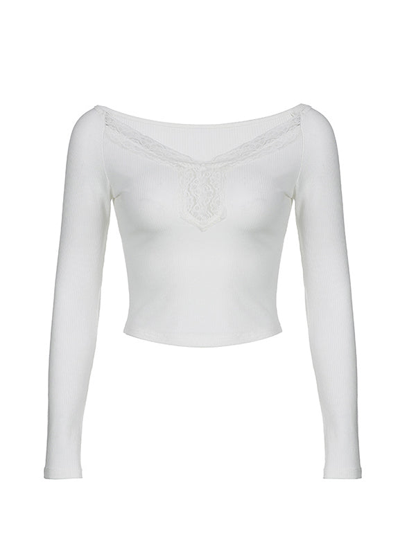 White Lace Trim Ribbed Long Sleeve Crop Top