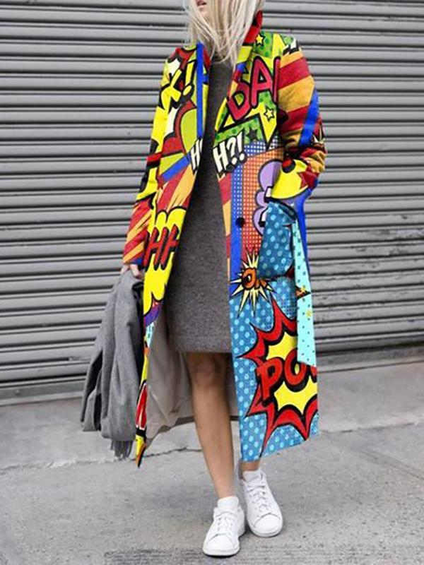 Women's Coats Cartoon Print Pocket Lapel Long Coat