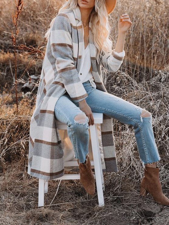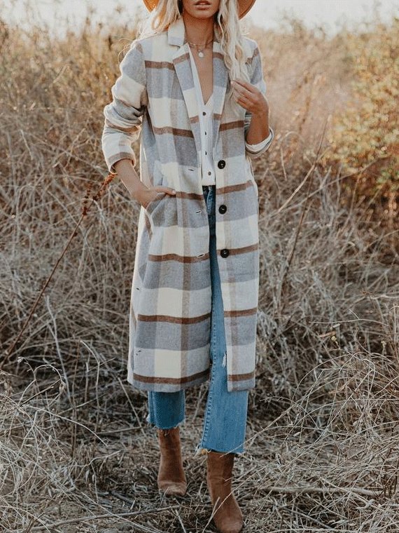Women's Coats Checked Button Pocket Long Woolen Coat