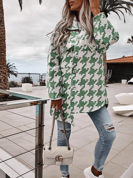 Women's Coats Fashion Loose Long Sleeve Houndstooth Woolen Coat