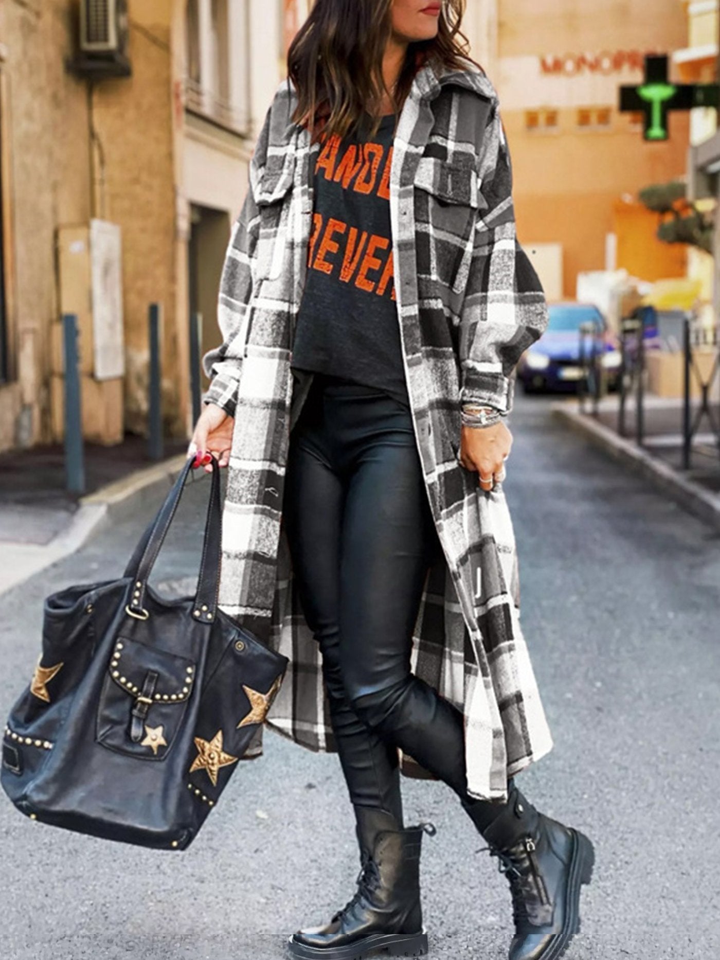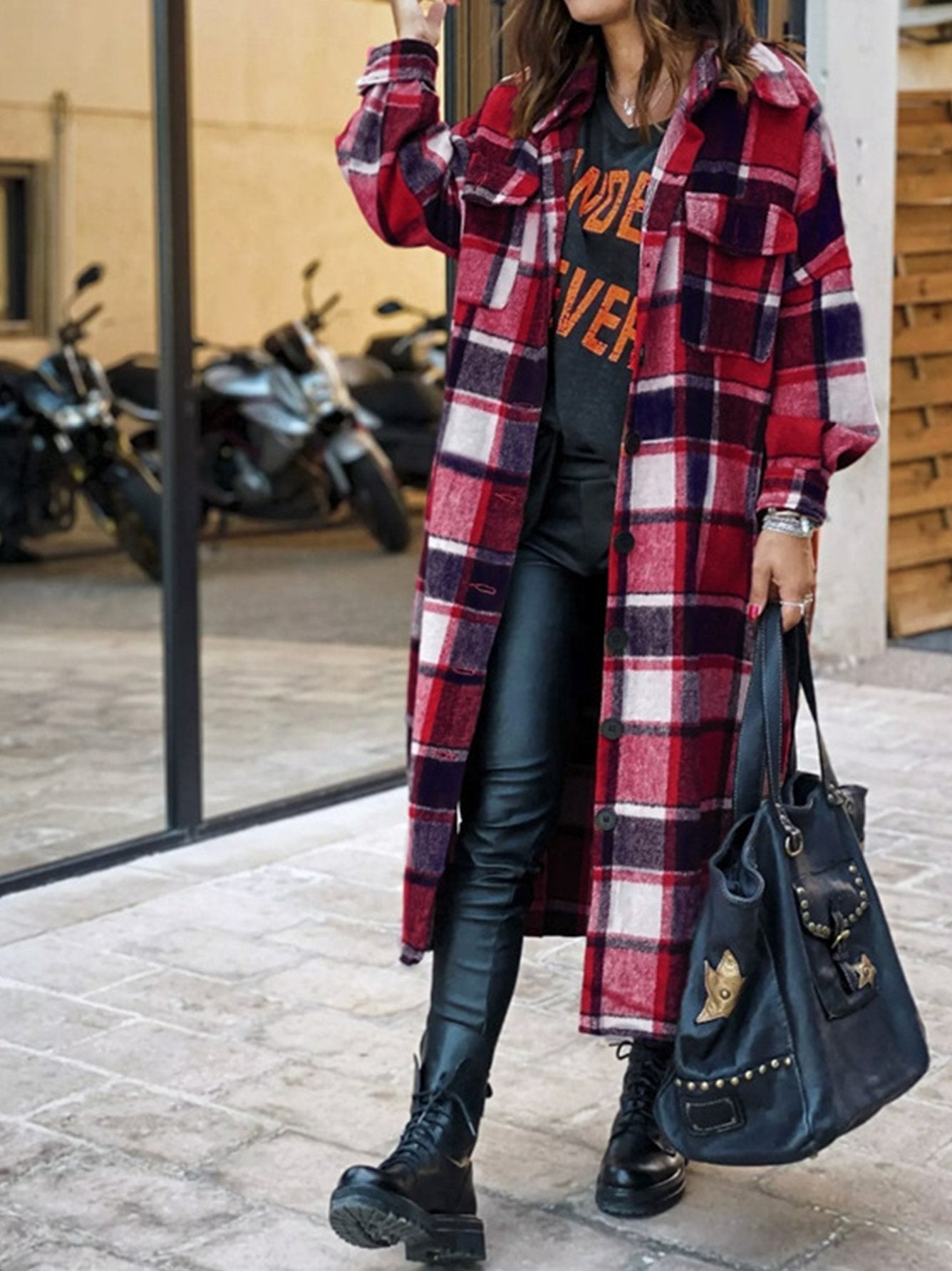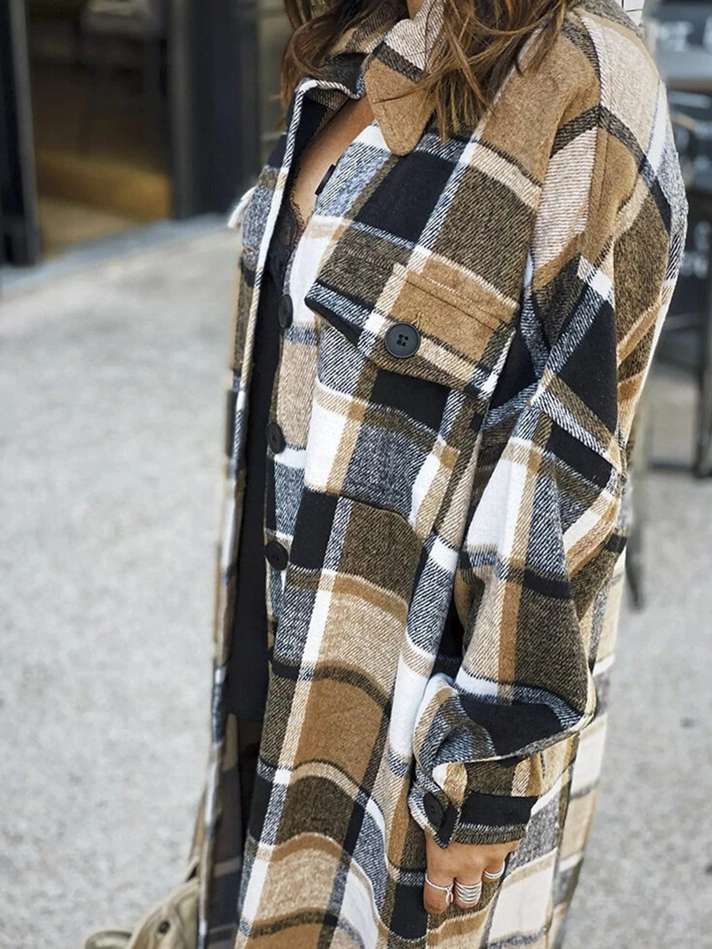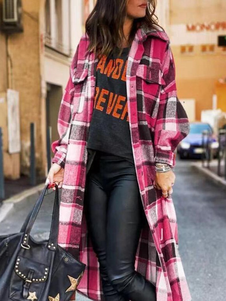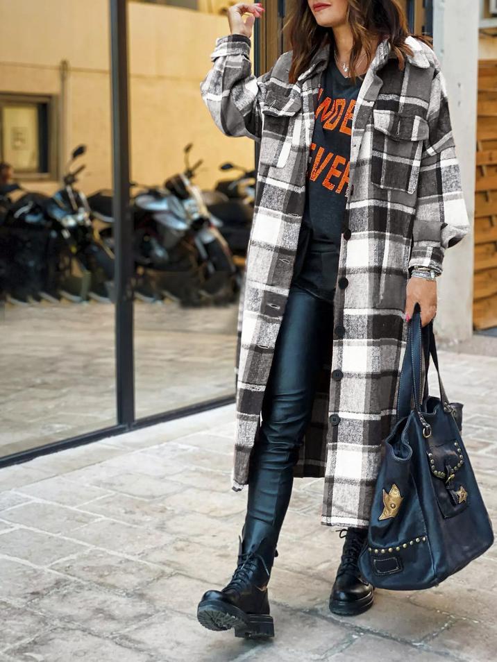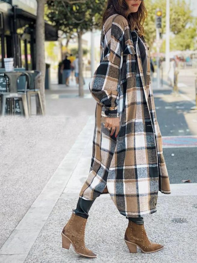 • Feature: Lapel. Plaid. Slit. Long