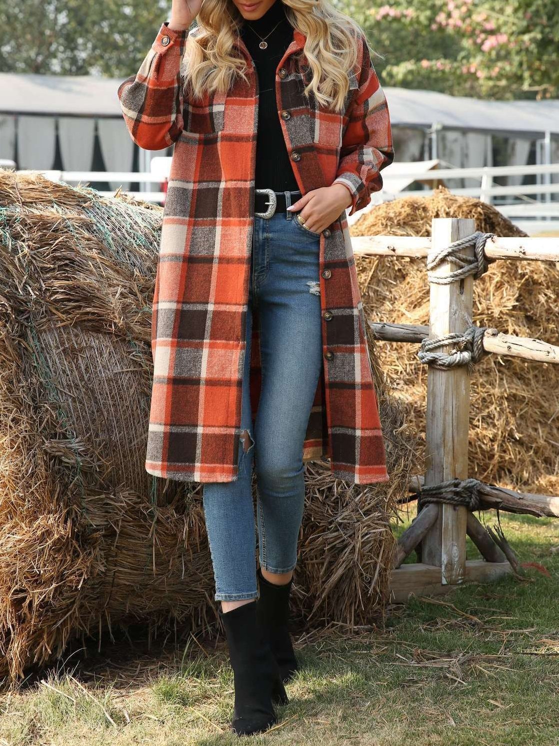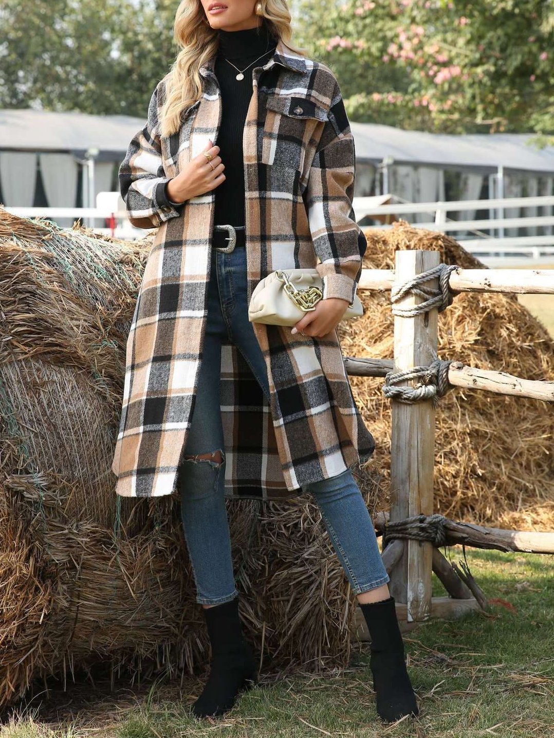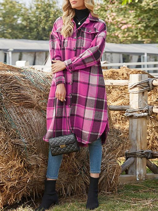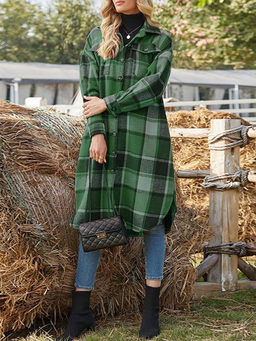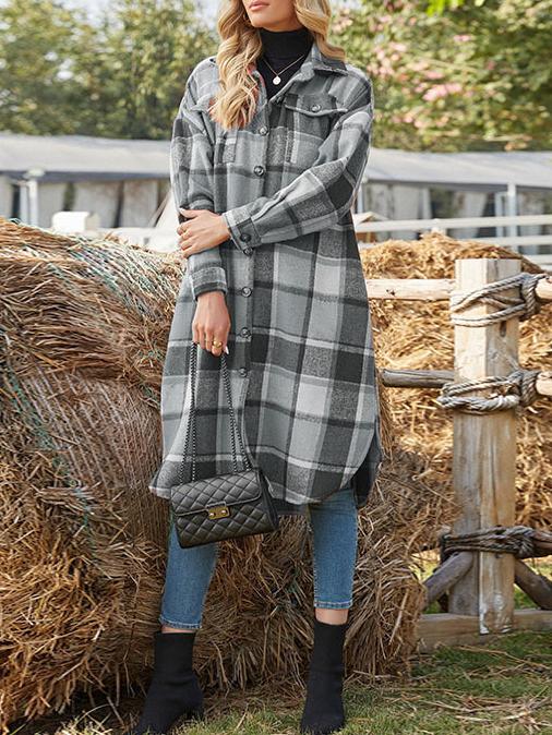 Women's Coats Long Sleeve Side Slit Lapel Woolen Plaid Shirt Long Coat