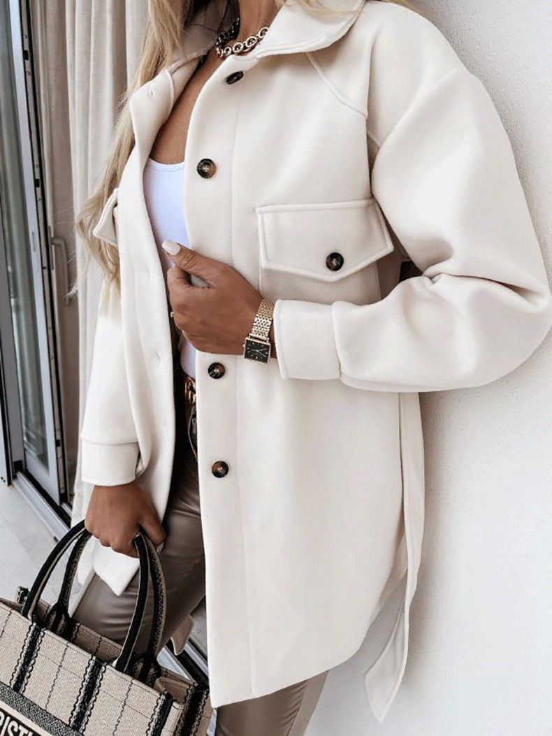 Women's Coats Long Sleeve Solid Lapel Button Belted Woolen Coat
