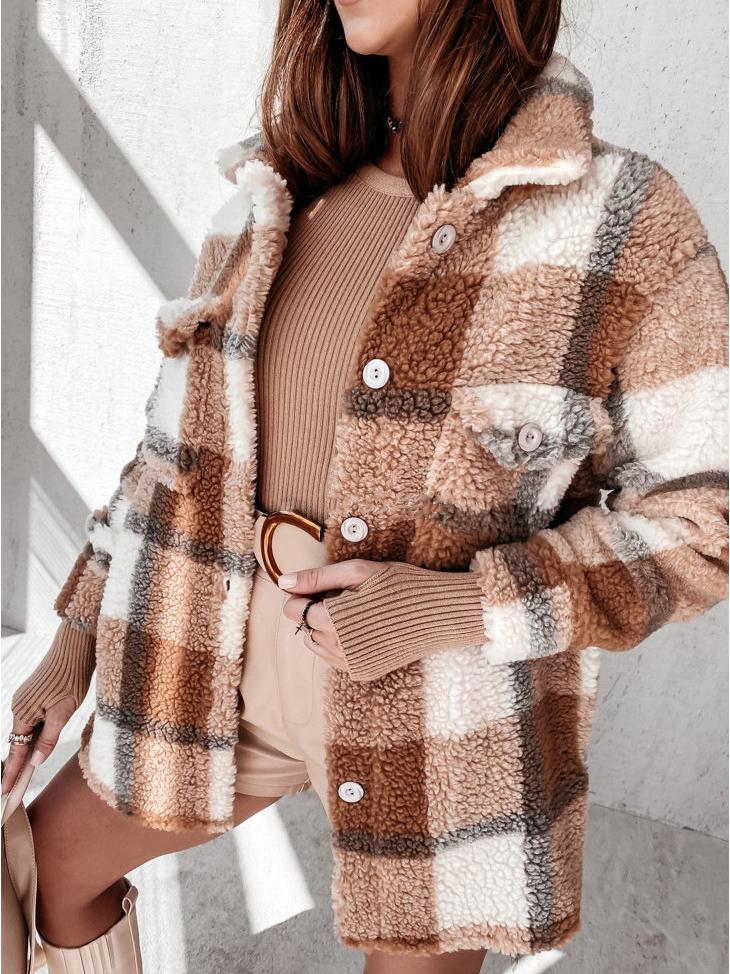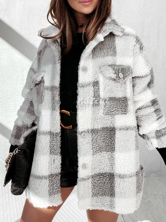Women's Coats Plaid Button Pocket Long Sleeve Fur Coat