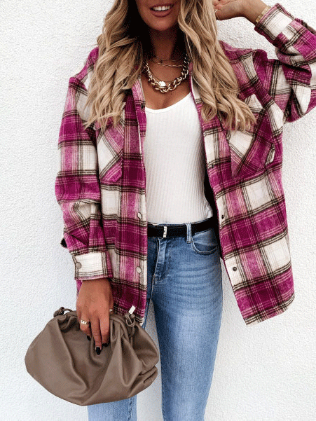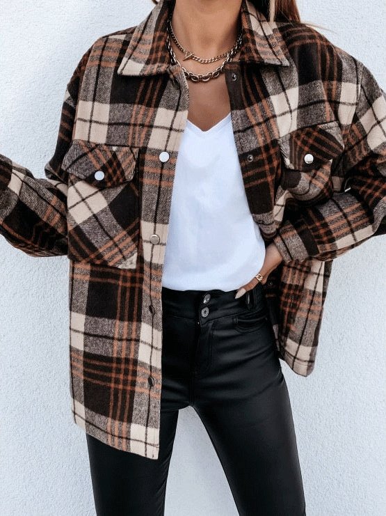 Women's Coats Retro Check Pocket Long Sleeve Shirt Coat
