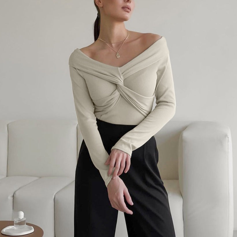 This top will add a touch of sophistication to any outfit. This classic top features a flattering an off-the-shoulder design. long sleeves .and a unique cross-front detail.