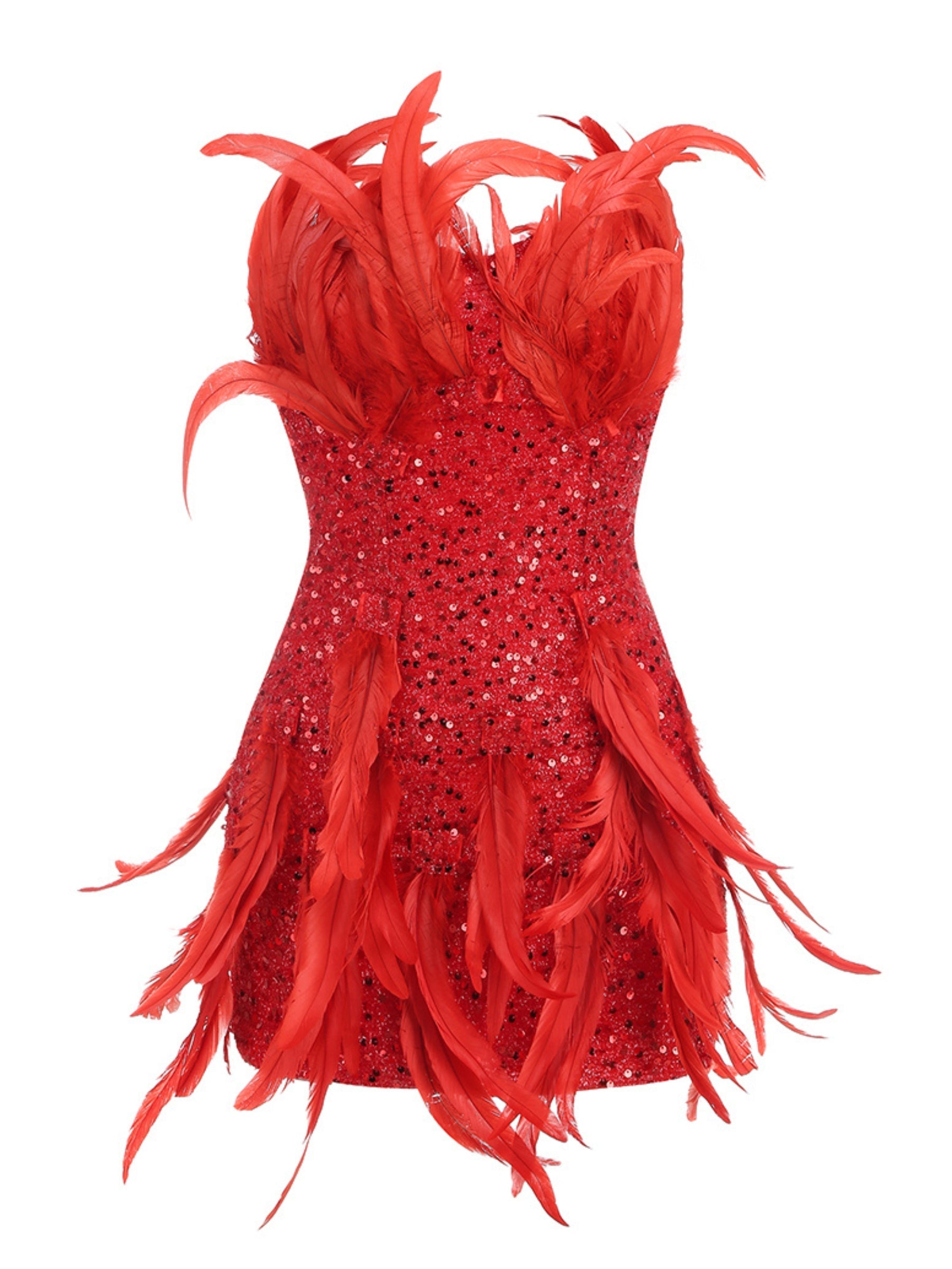 Get ready to turn heads in our Yaiza Sequin Mini Dress! This stunning red dress features a sleeveless design and a flattering tube top style. Adorned with feather embroidery. it's the perfect mix of elegant and sexy. Part of our Aesvs Party & Cocktail Collection.